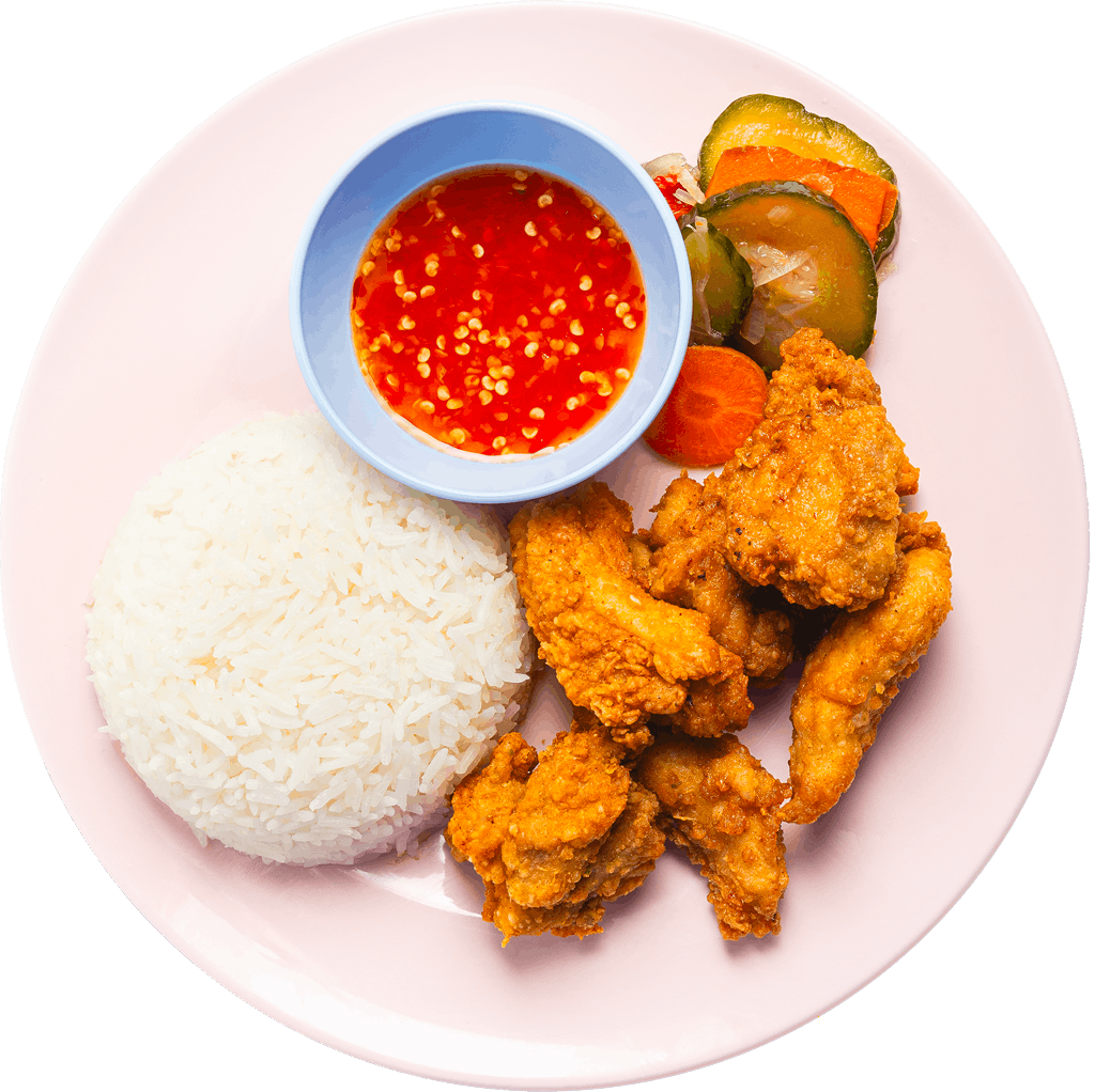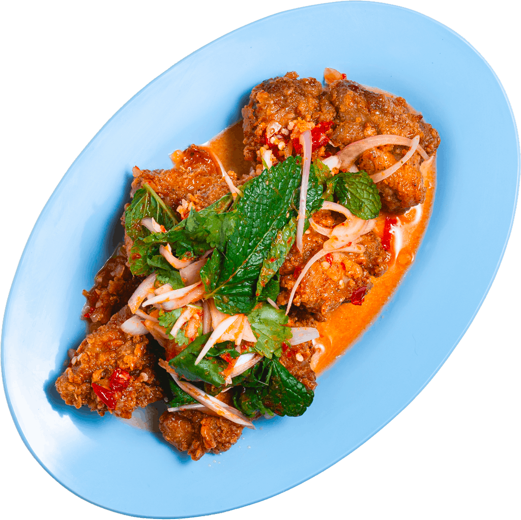 Poulet frit et sa panure croustillante, sauce spicy sweet chili, herbes fraîches. Relevé, frais, punchy.
