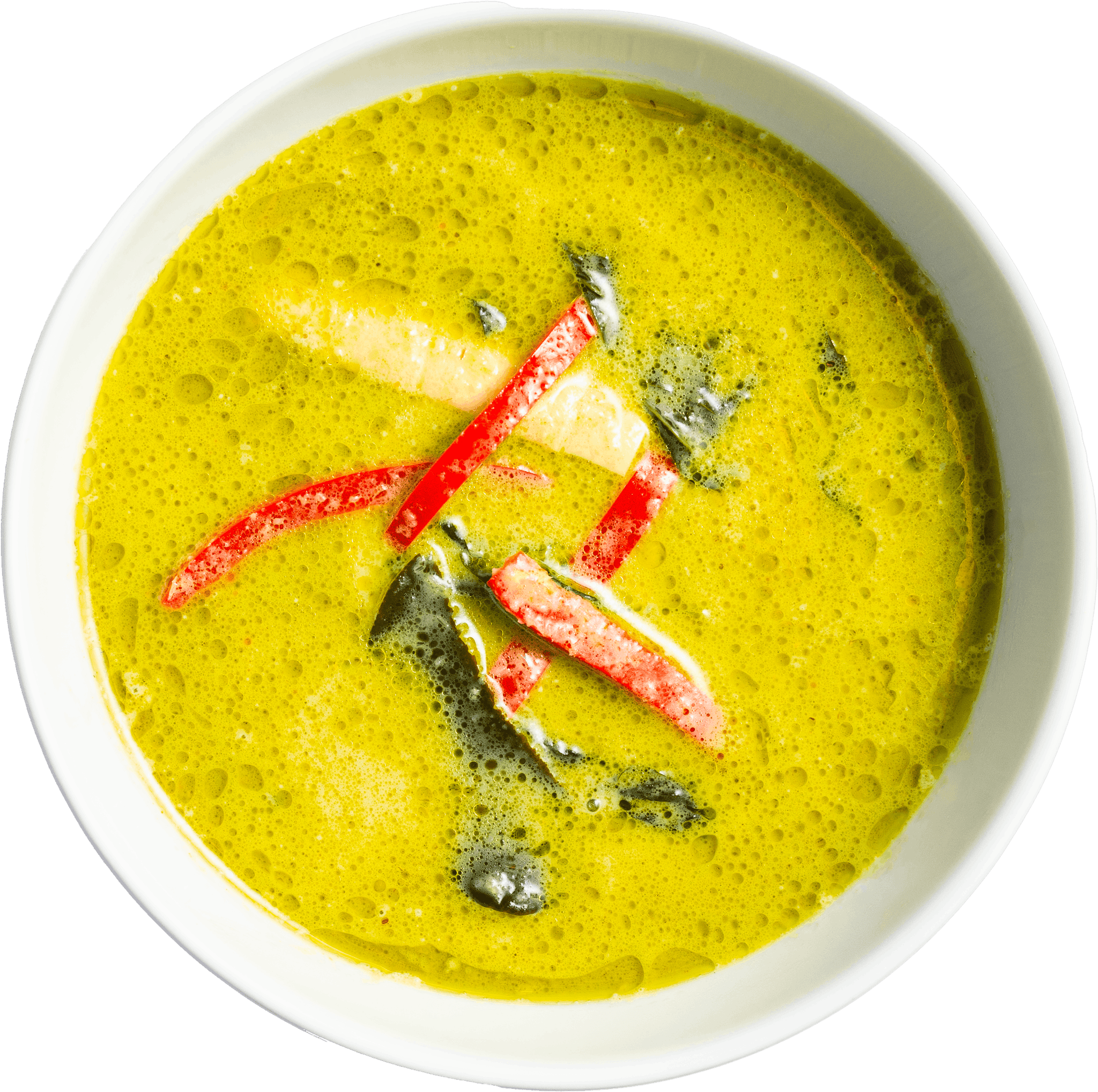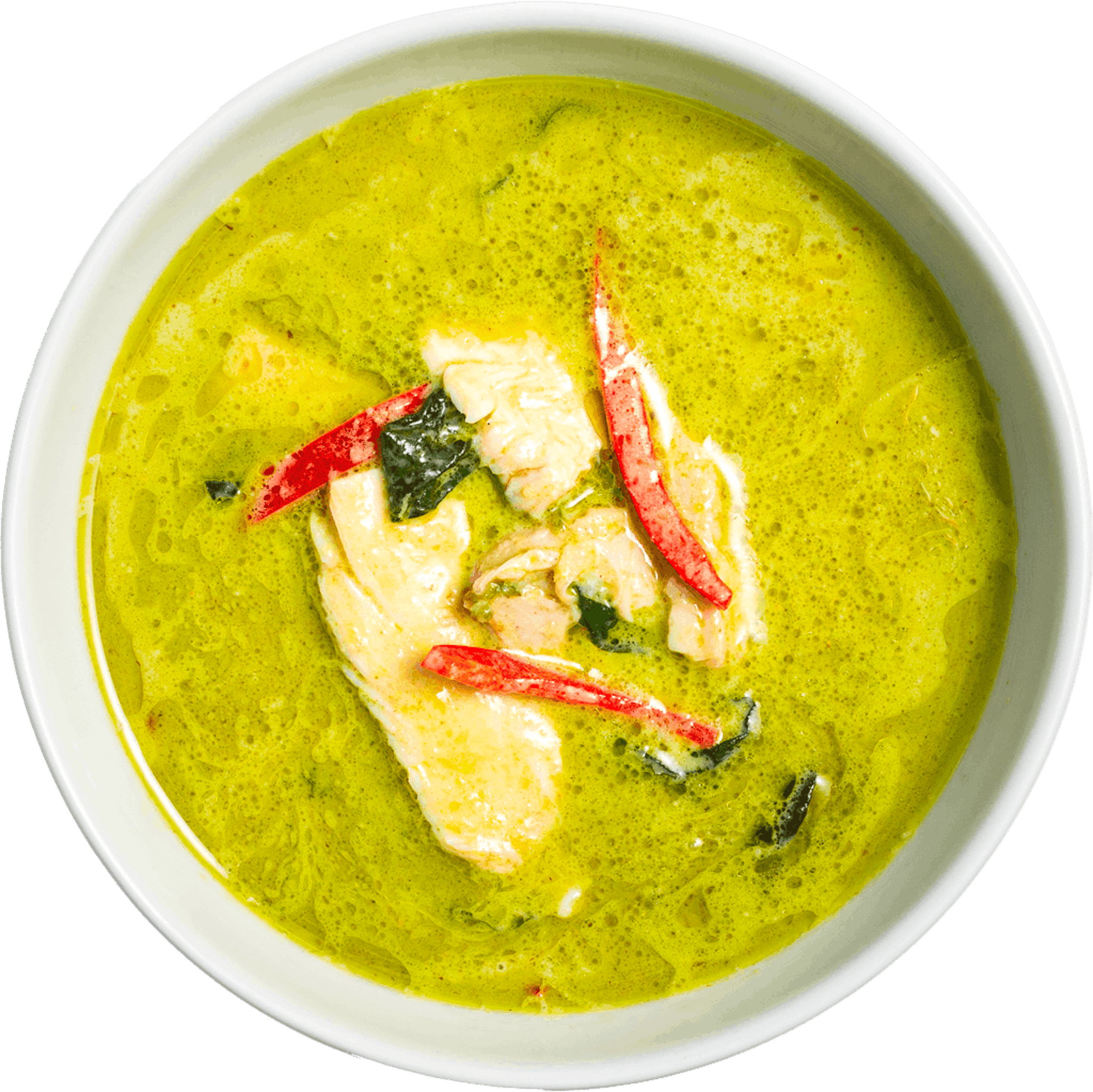 Curry vert poulet au lait de coco. Servi avec du riz.