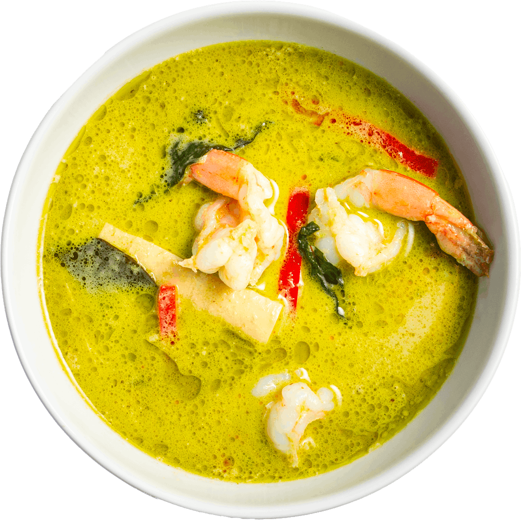 Curry vert crevettes au lait de coco. Servi avec du riz.