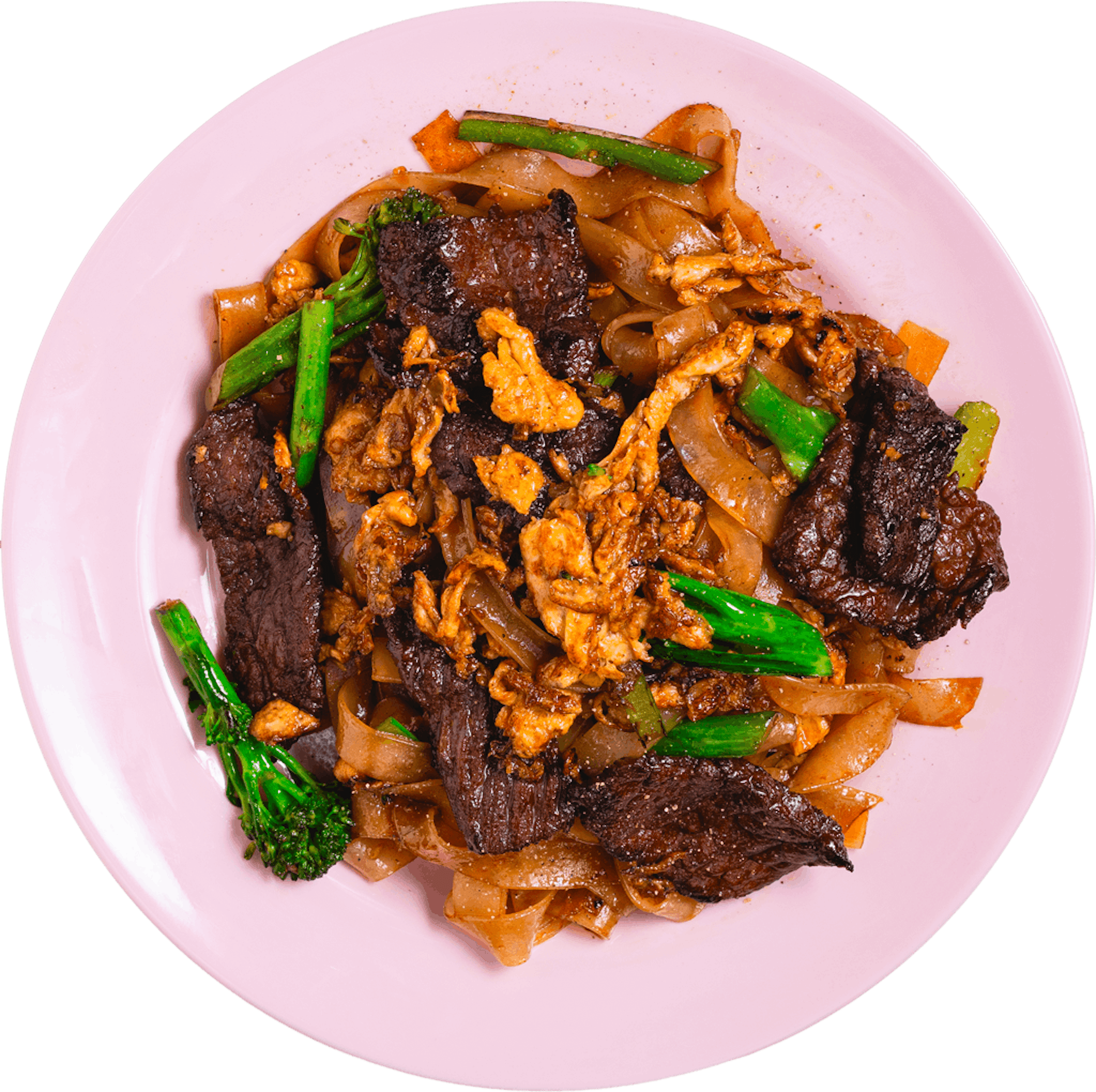 Nouilles de riz larges sautées au wok, boeuf, broccolini, oeuf.