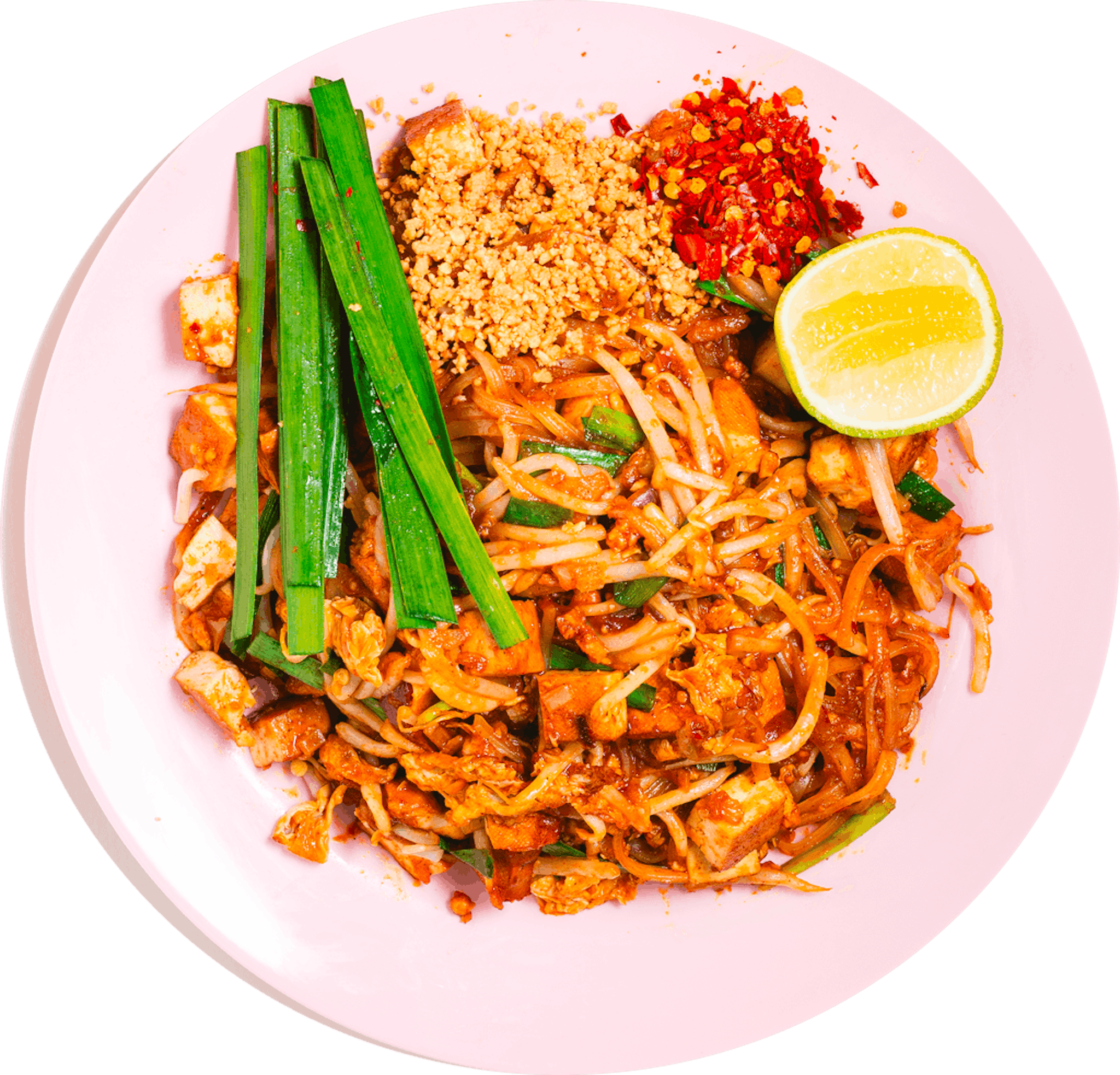 Nouilles de riz fines sautées au wok, tofu, oeuf, et sauce tamarin secrète.