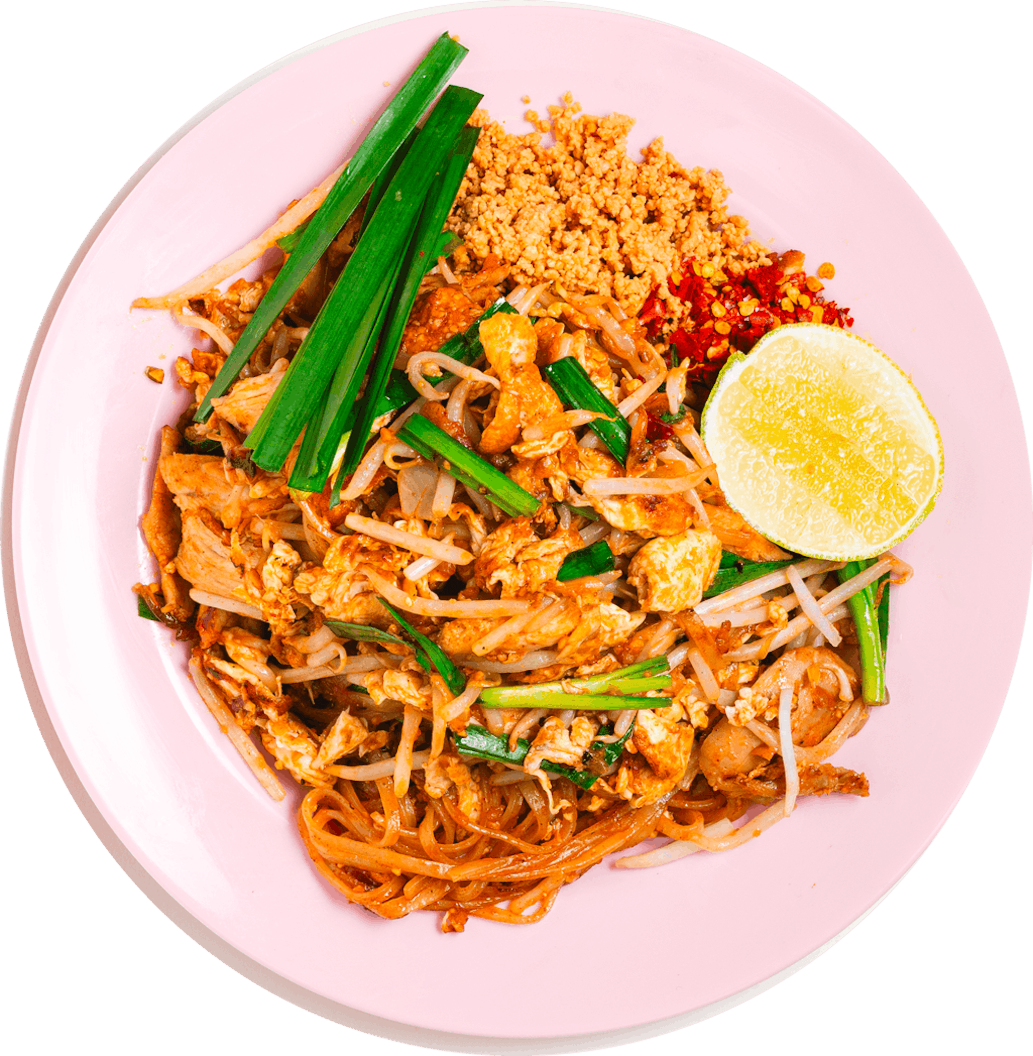 Nouilles de riz fines sautées au wok, poulet, tofu, oeuf, et sauce tamarin secrète.