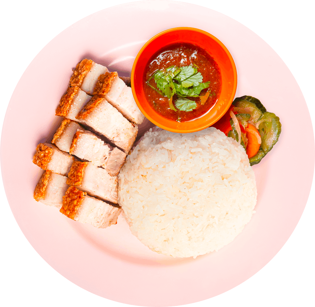 Poitrine de porc croustillante. Servi avec riz, sauce signature jaew et pickles.