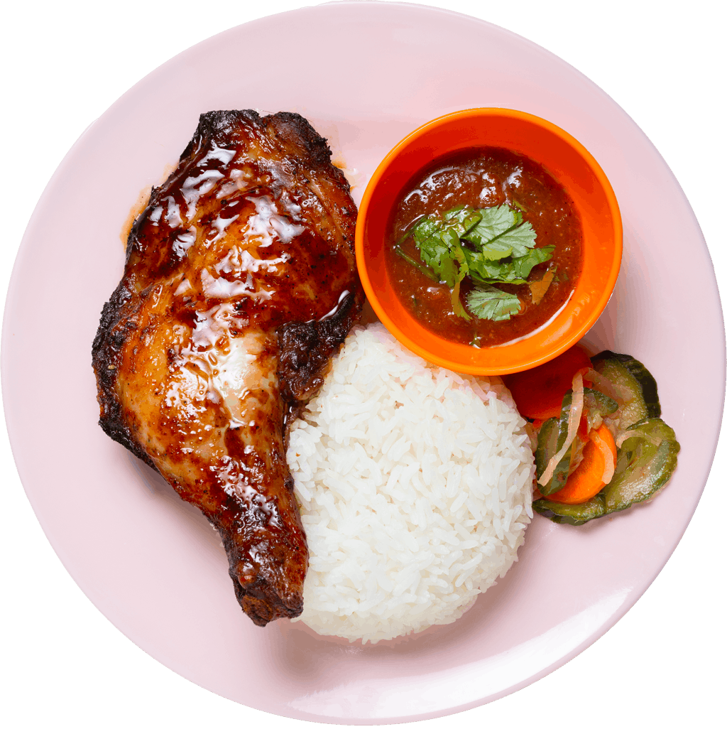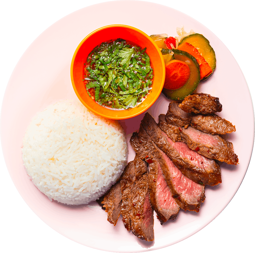 Boeuf grillé mariné à la citronnelle et huile d'échalote. Servi avec riz, sauce signature jaew et pickles.