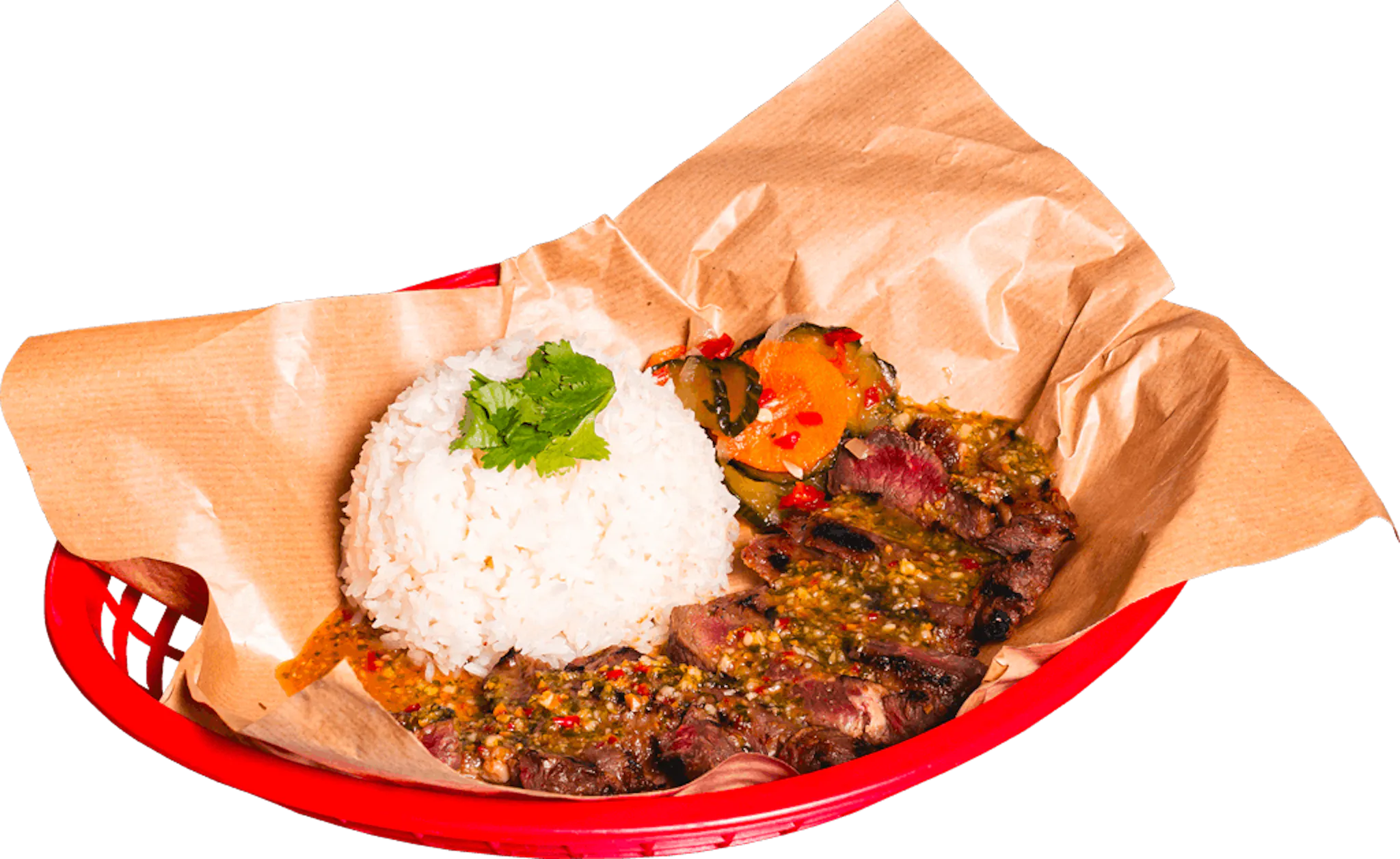 Boeuf mariné à la citronnelle et l’huile d'échalote, grillée à la flamme. Servi avec nos pickles, ton accompagnement préféré et la sauce de ton choix.