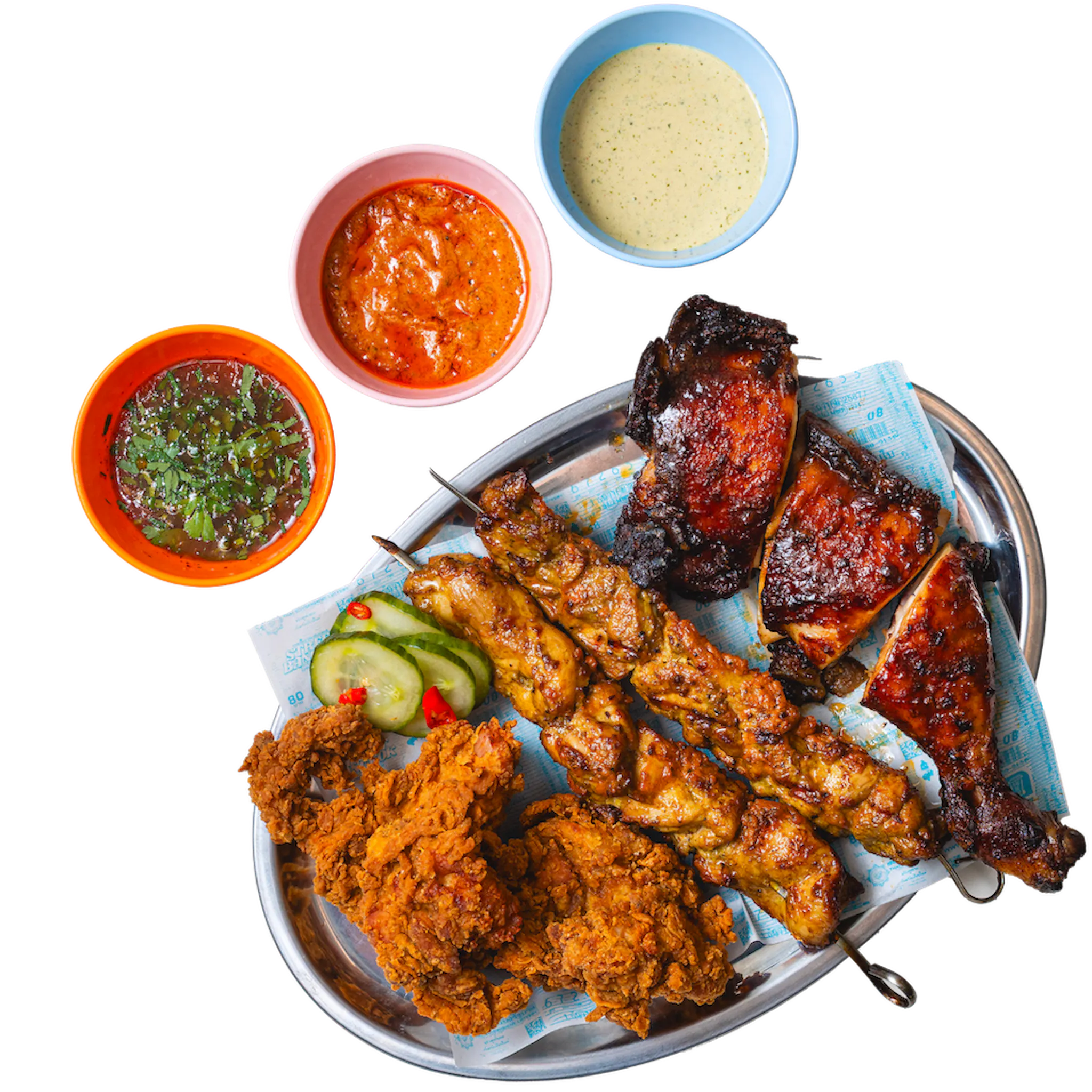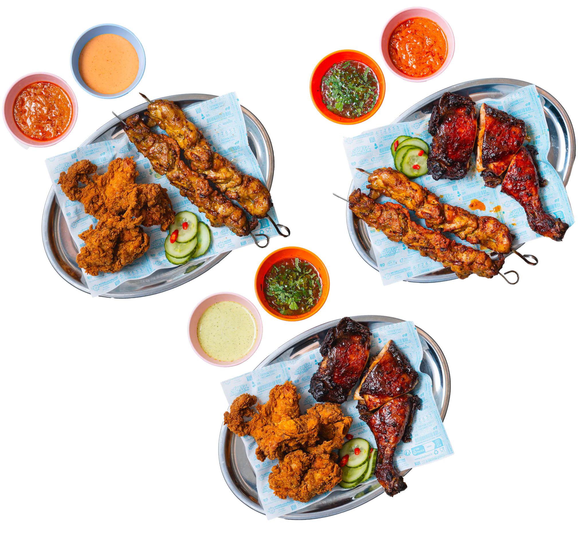 Triple portion de Thaï Chickens à choisir entre : Gai Yang, Fried Chicken, Grilled Chicken Satay. Servi avec 3 dips au choix et pickles.