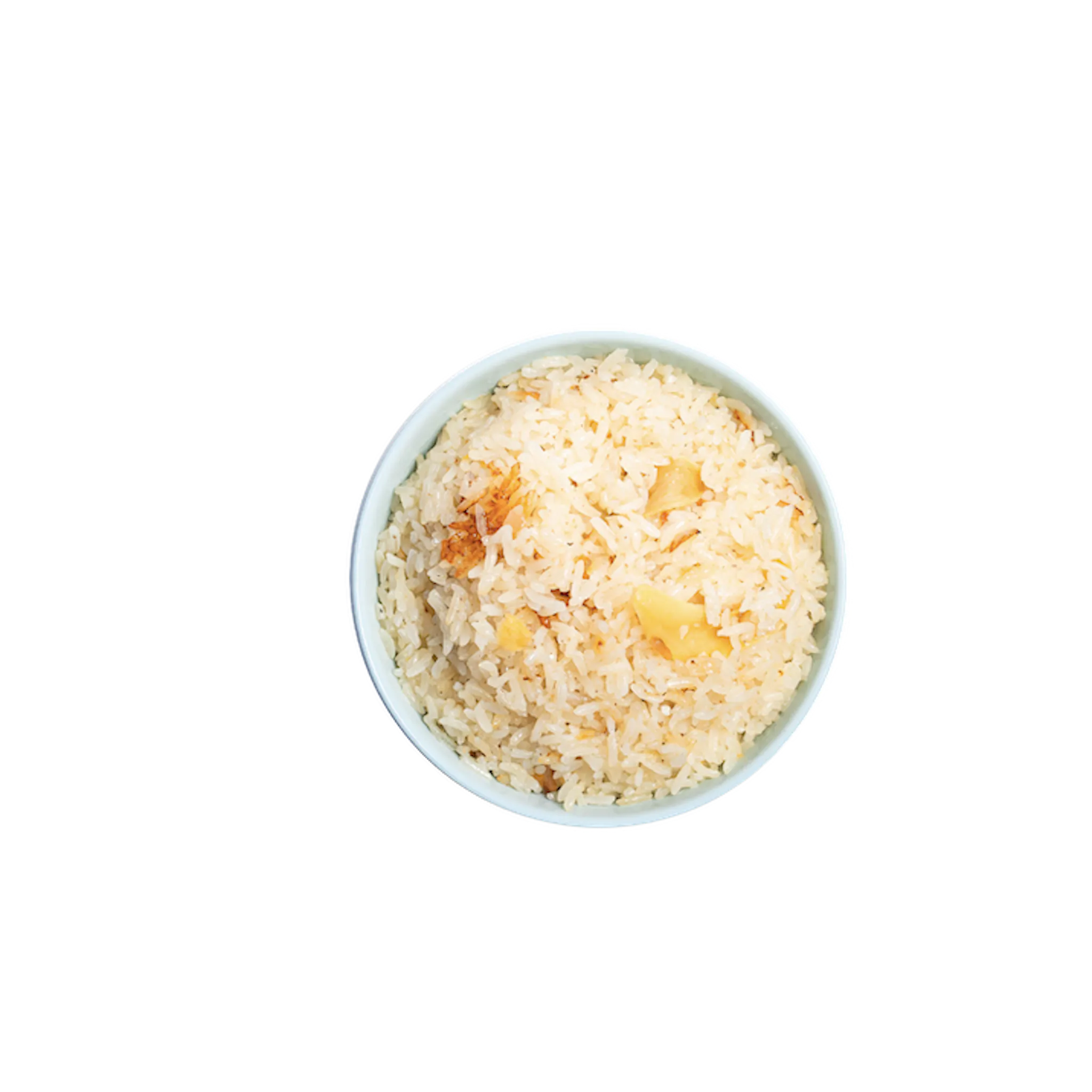 Riz parfumé au bouillon de poulet, ail et gingembre.