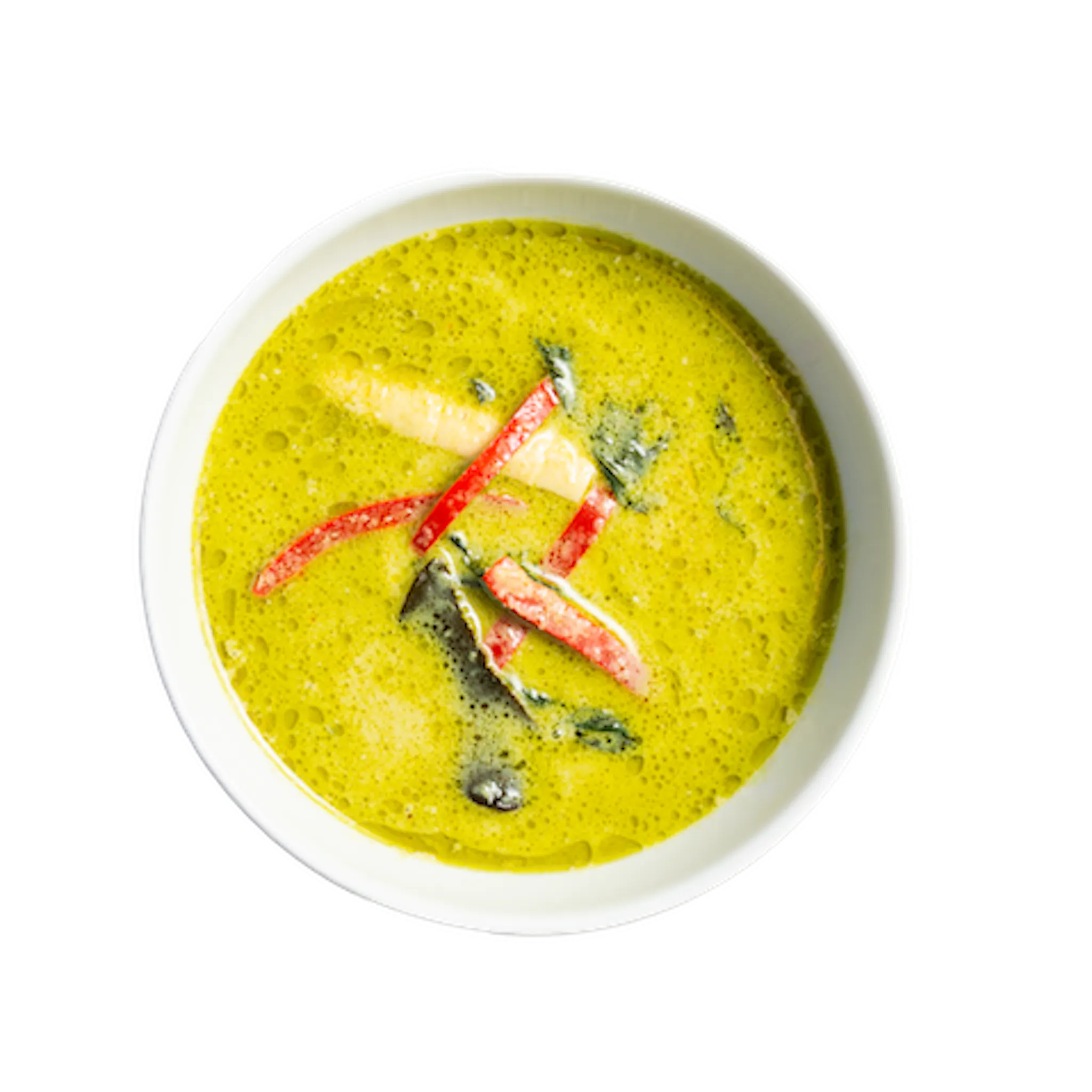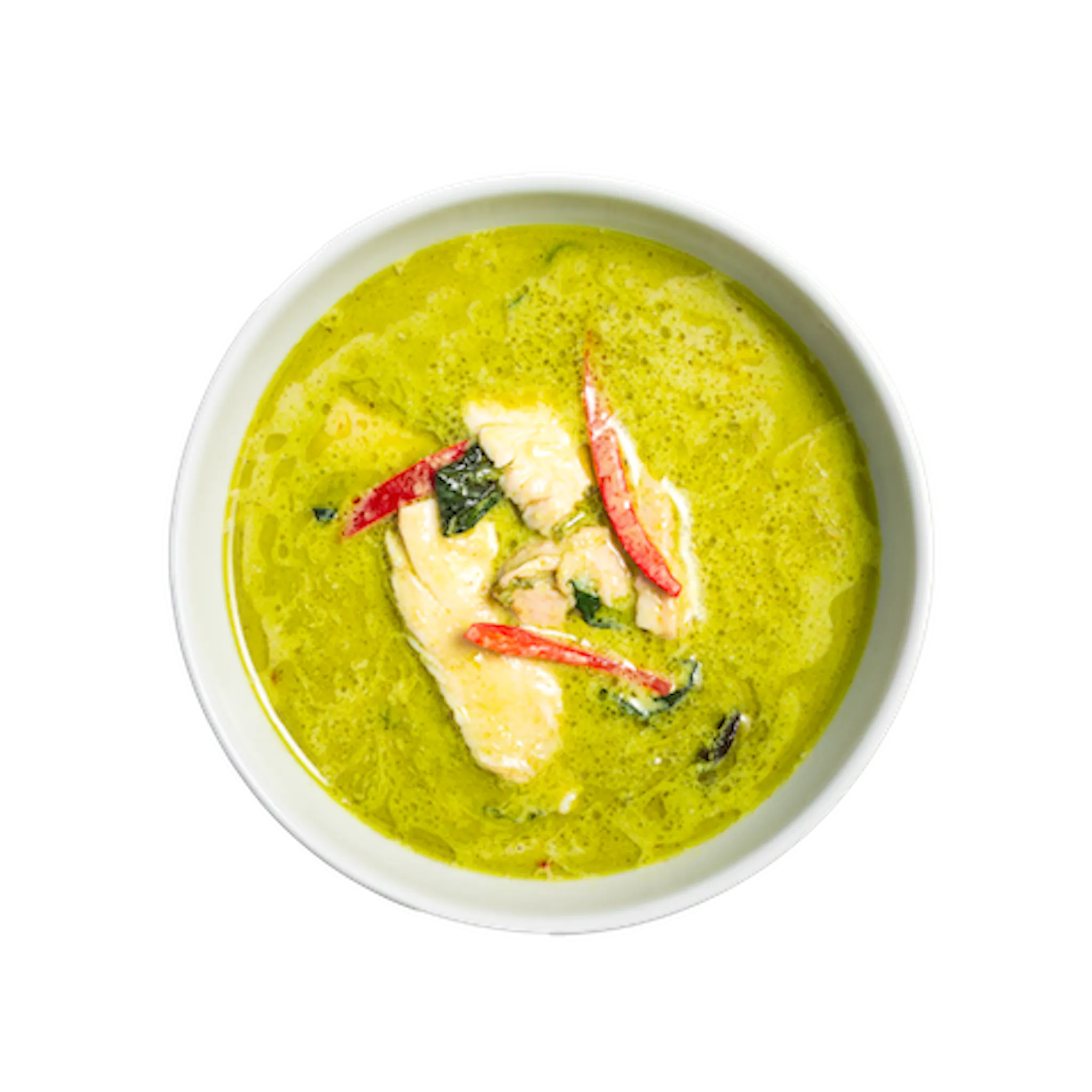 Curry vert poulet au lait de coco. Servi avec du riz.