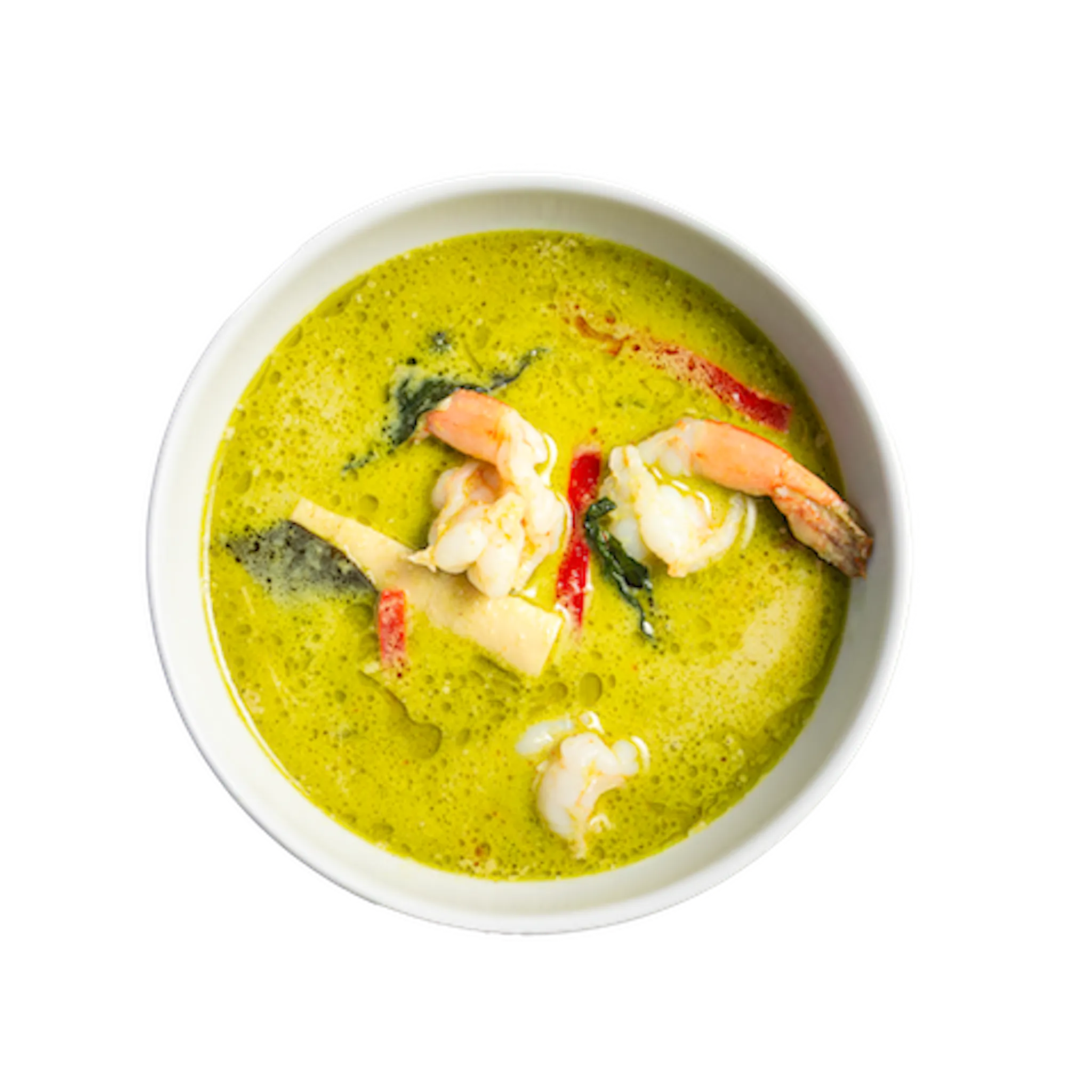 Curry vert crevettes au lait de coco. Servi avec du riz.