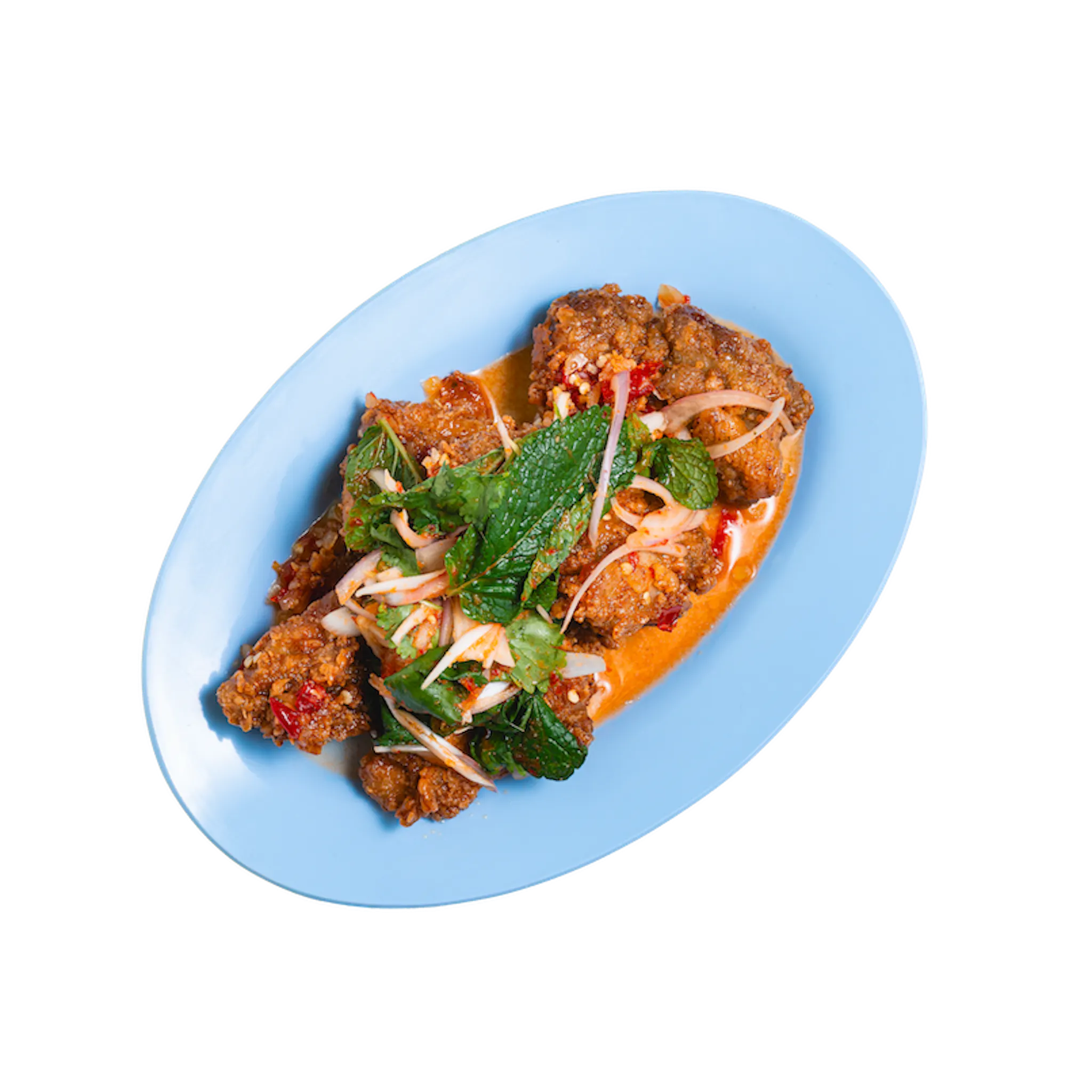 Poulet frit et sa panure croustillante, sauce spicy sweet chili, herbes fraîches. Relevé, frais, punchy.