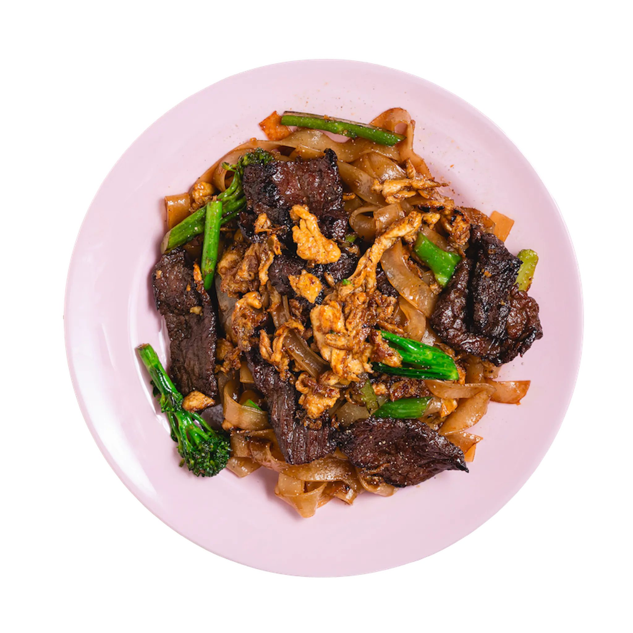Nouilles de riz larges sautées au wok, boeuf, broccolini, oeuf.