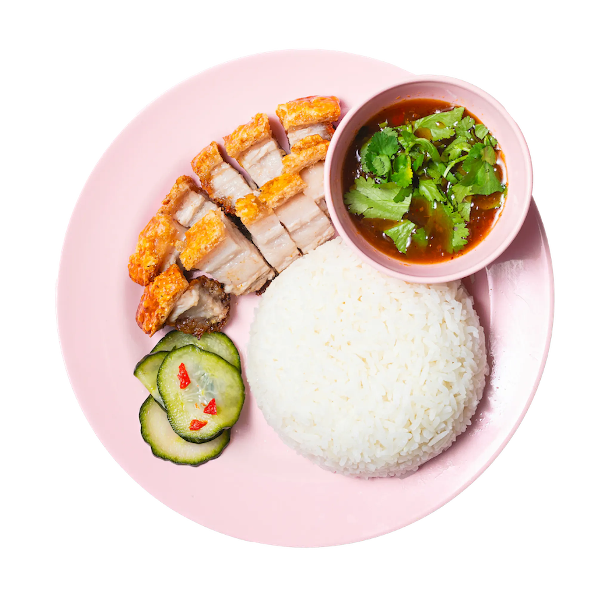 Poitrine de porc croustillante. Servi avec riz, sauce signature jaew et pickles.