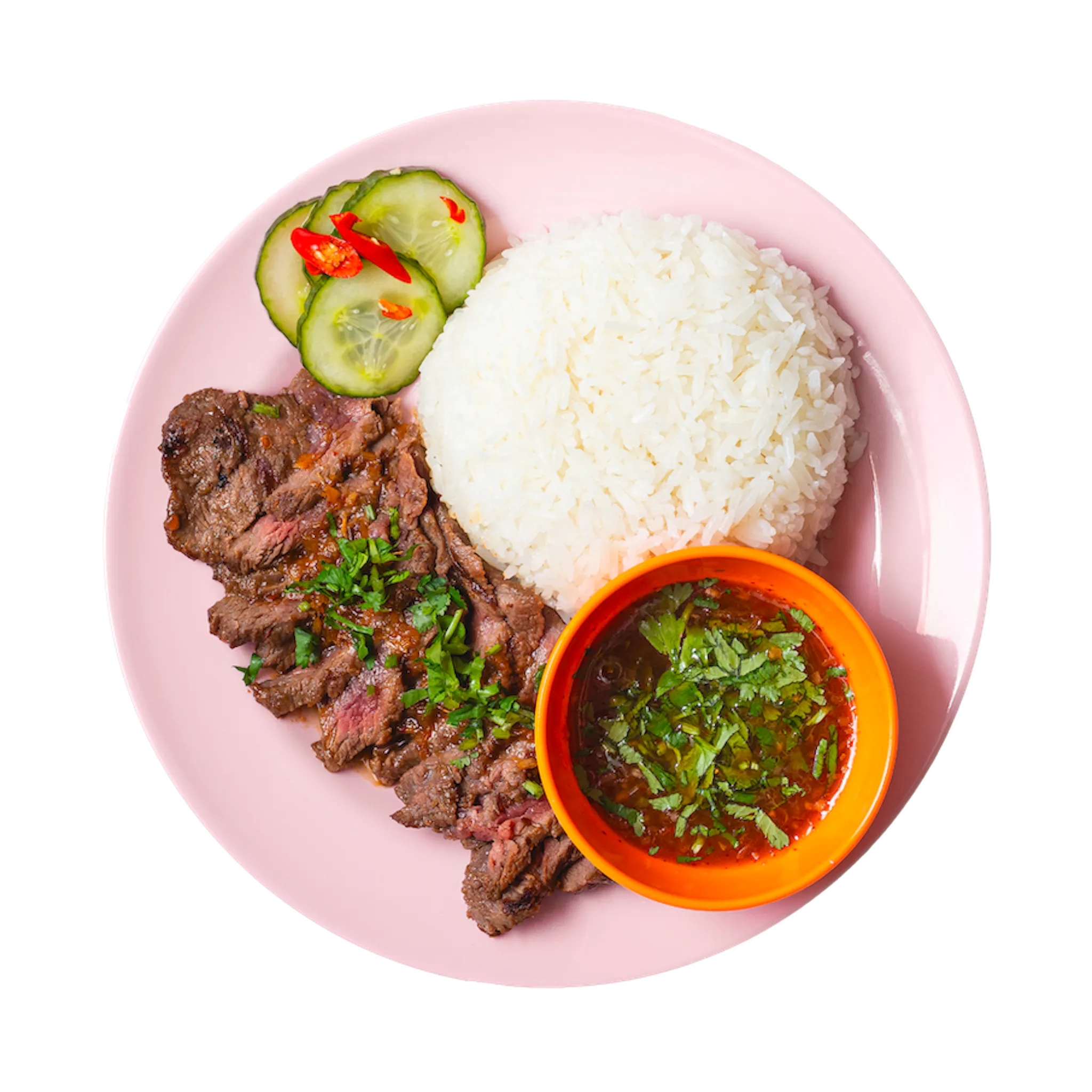 Boeuf grillé mariné à la citronnelle et huile d'échalote. Servi avec riz, sauce signature jaew et pickles.