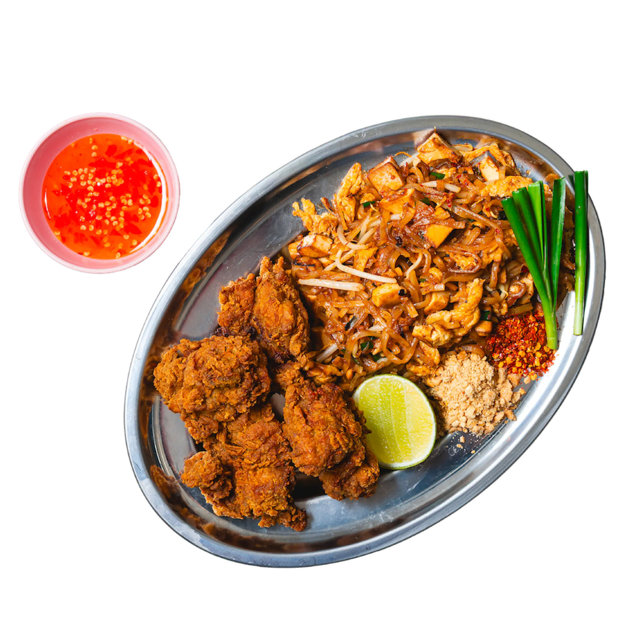 Nouilles de riz sautées au wok, oeuf, tofu, pousses de soja, cacahuètes, et sauce tamarin secrète. Poulet frit on top.