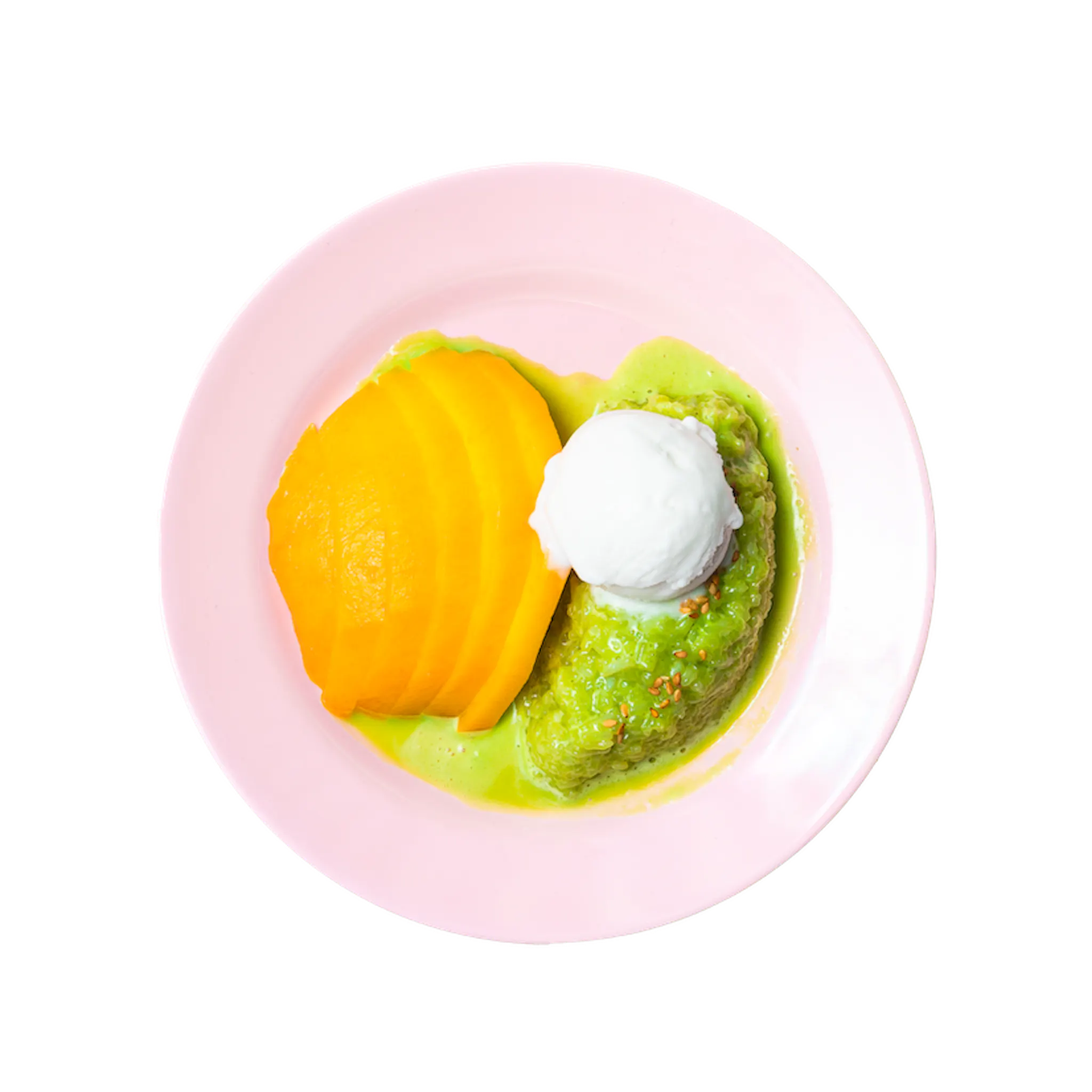 Riz gluant au pandan, lait de coco, mangue fraîche et boule de glace coco.